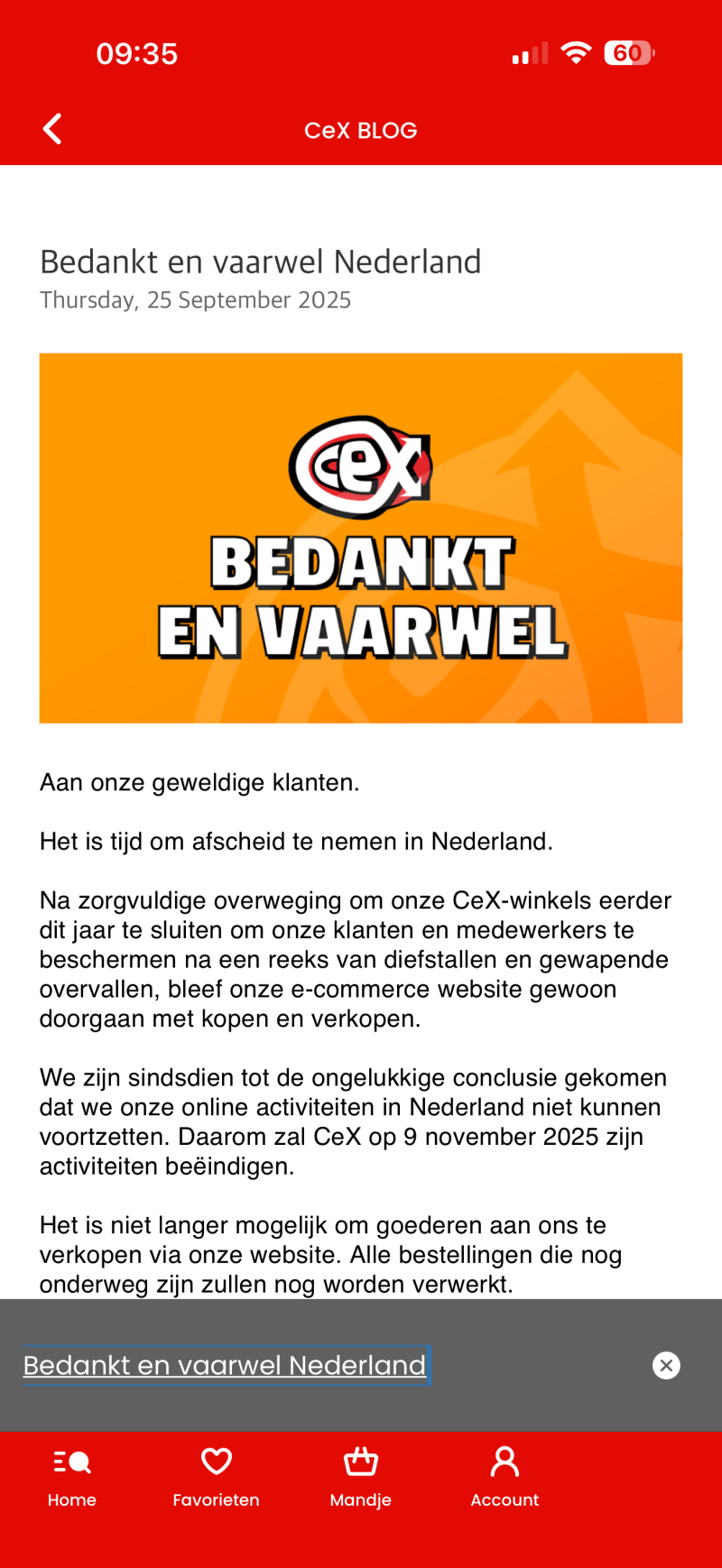 Een aankondiging dat winkelketen CEX gaat stoppen in Nederland.